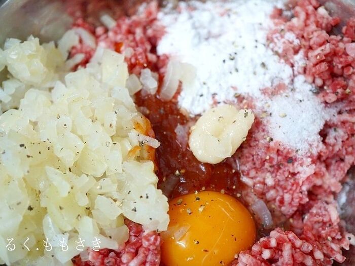 これいつもの我が家のハンバーグの裏ワザで、つなぎのパン粉を入れなくても、水を入れるだけで、柔らか肉種が出来ます。食べると柔らかです^^