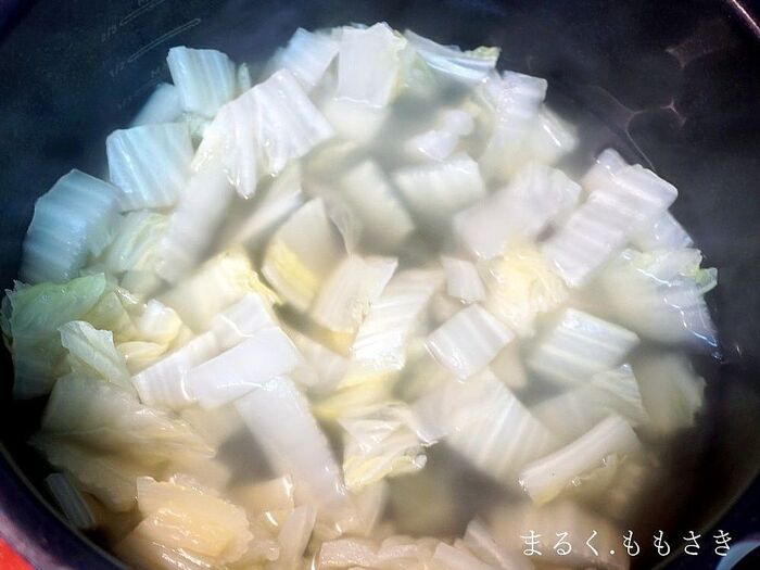 ①鍋に水1Lと☆を入れ白菜の芯だけを入れ沸騰したら中弱火にして蓋をし5分煮込む。