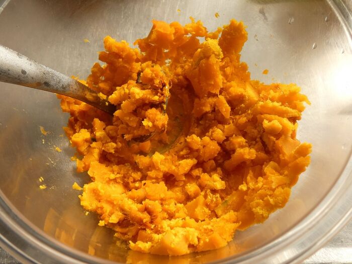 かぼちゃは皮をむき、小さく切って耐熱容器に入れます。電子レンジ600wで2分半加熱し、熱いうちにつぶします。
