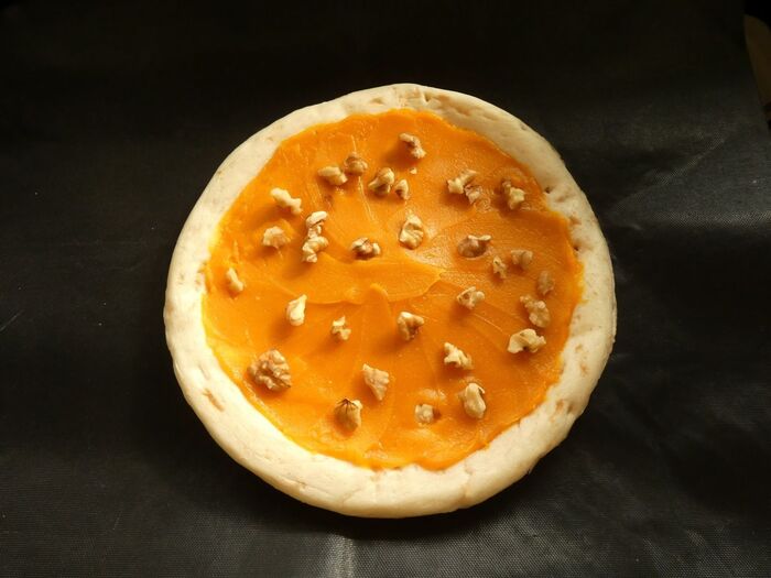 市販のビザ生地にかぼちゃペーストを乗せてのばします。小さく割った胡桃をトッピングし、オーブン200℃で7~8分焼きます。