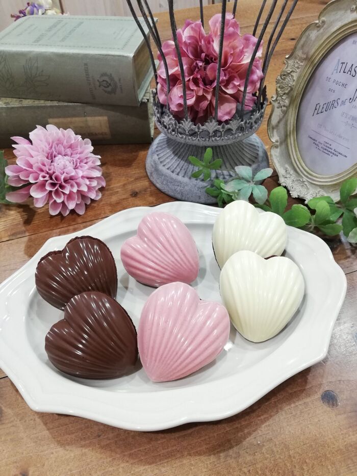 ※ハート型一つに付き13~14g程度。入れ過ぎるとマドレーヌを乗せた時にチョコが溢れるので注意。