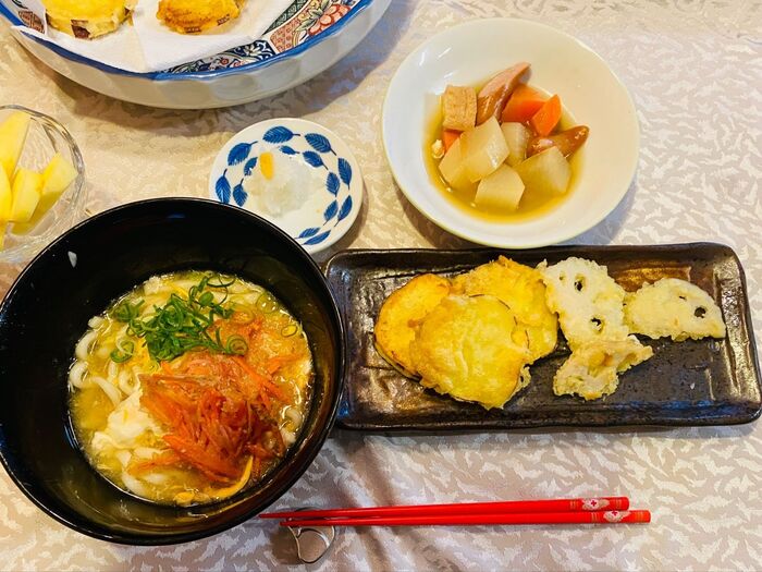 紅生姜の入ったかき揚げを作ってのせました。