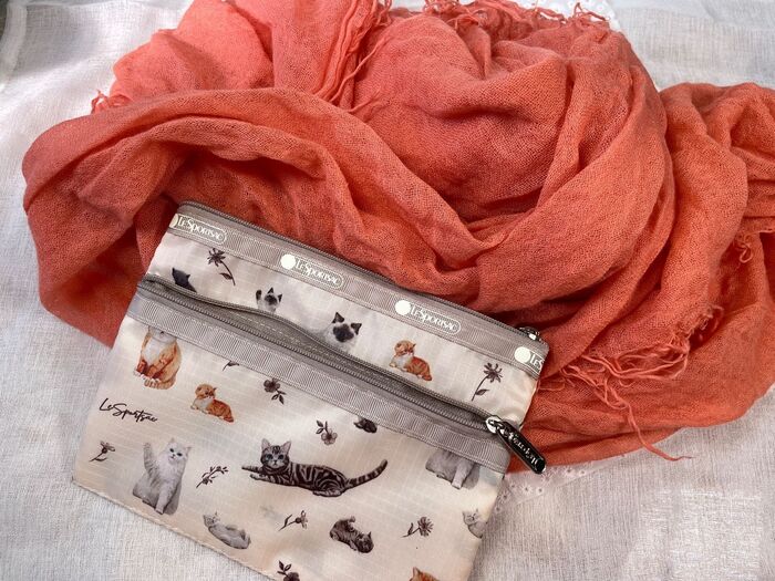 CHAN LUUのストールを年中持ち歩いてますが、引っかかったりかさばるのでいつも数々の付録ポーチに入れています。