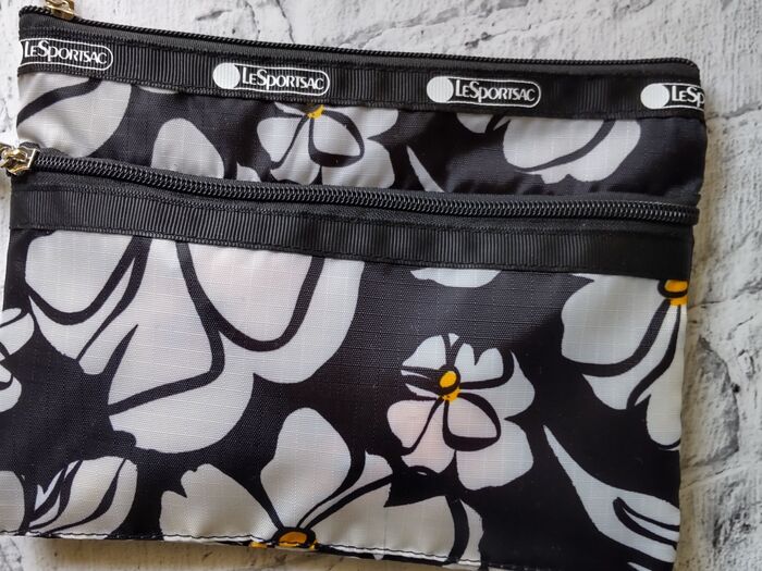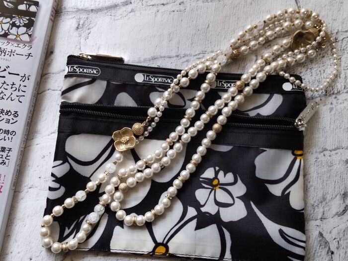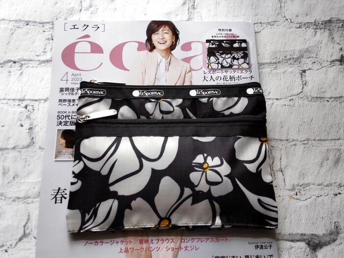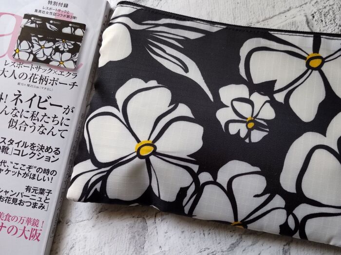 レスポートサックは、大人気のブランド、愛用している方も多いブランドではないでしょうか?今回のエクラとコラボしたポーチは、ブラックアンドホワイトブルームズとゆう絵柄で、ブラックベースにホワイトの花モチーフが描かれた、モダンで上品な印象のフラワープリントですね、お花の黄のカラーが、華やかさをぷらす♪