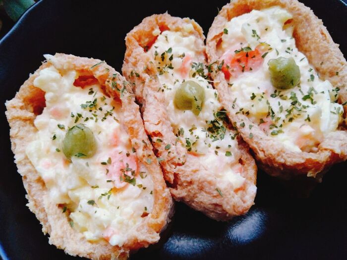 5.いなり揚げは口を開いてポテトサラダを詰めて完成。