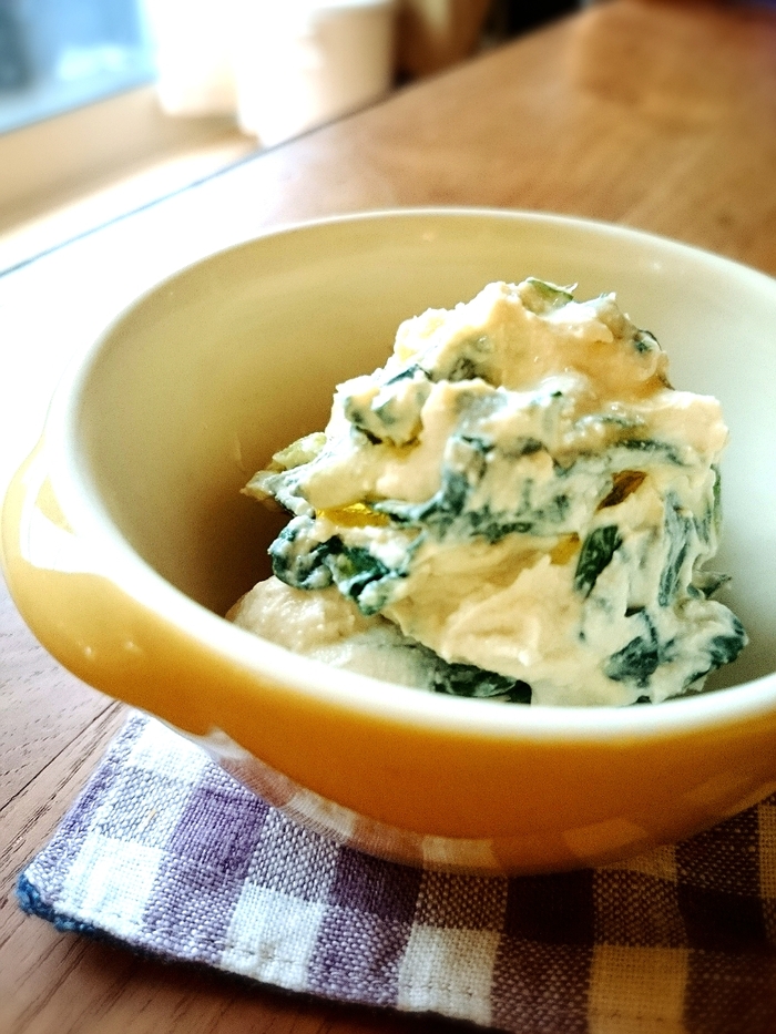 茹でたほうれん草と和えれば、あっとゆう間にこっくりおいしい白和えの完成です。