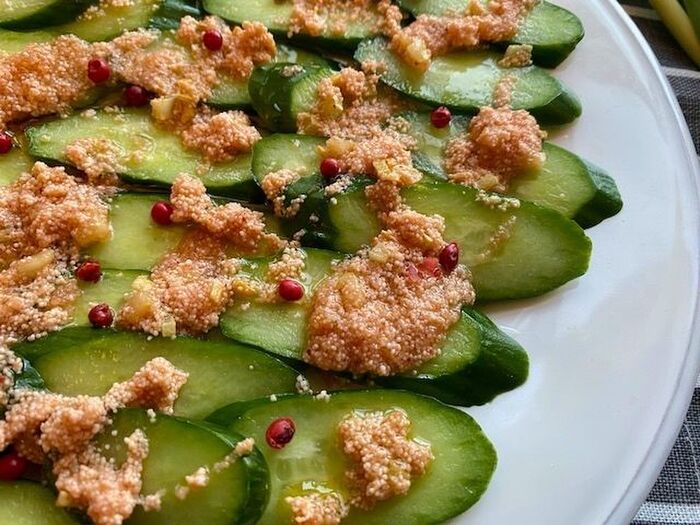 きゅうりの上にオイルごとかけてピンクペッパーを散らす