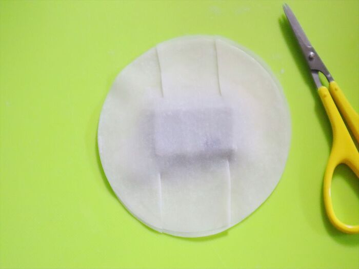 餃子の皮の真ん中にチョコレートを乗せます。チョコレートは板チョコを使うなら1片でOK。餃子の皮の直径の1/2~1/3程度の長さに収まるくらいならリボン型にできますが、厚みがあると後で包みにくいので、キューブ型ではない方が向いています。