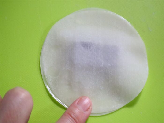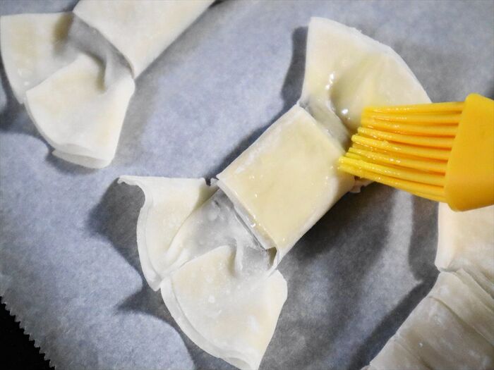 皮の端に水を塗って、もう1枚被せてしっかり押さえて貼り付けます。