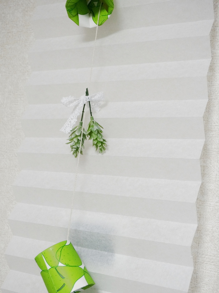 壁にそのままモビールを吊るすよりも、白いプリーツブラインドを下に持ってくることで、カップとセリアグリーンがよりキレイに見えています。