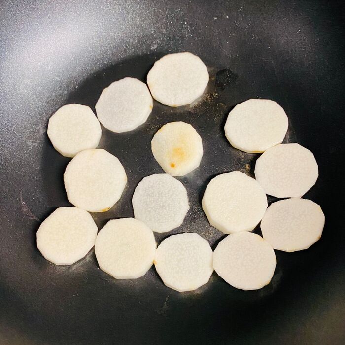 長芋は皮を剥き、輪切りにします。フライパンを熱し、焼きます。フライパンはテフロン加工なので油は使いませんが、そうでない場合は小さじ1ぐらい油を入れて下さい。
