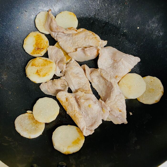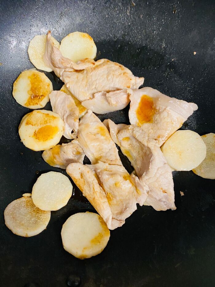 次に、豚肉を食べやすい大きさに切って、生姜でよくまぶしておいたものを加え、よく炒めます。