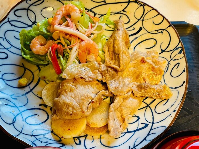 器に盛り付け、レタス、カニカマ、エビなどのサラダを添えました。