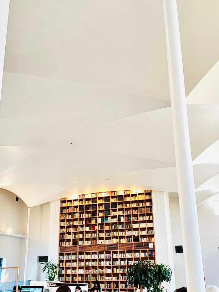そこには大きな本棚が飾ってありました。かつて図書館だった名残を感じますよ。