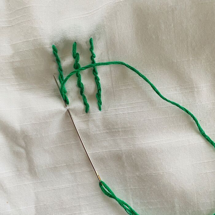 緑の刺繍糸でなぞるようにアウトラインステッチします。(返し縫いみたいな感じです)