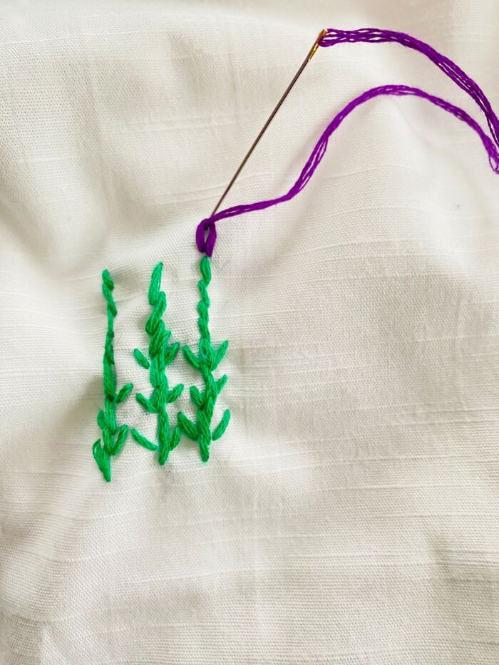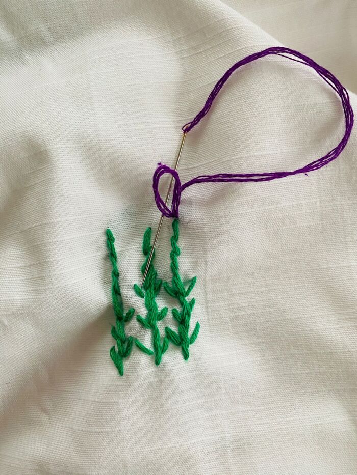 紫色の刺繍糸で、丸くなるように刺し、