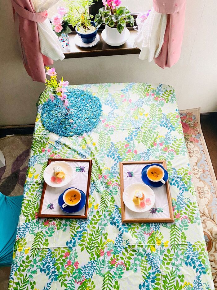 テーブルクロスの上に、ランチョンマット風のトレーに仕上げました。
