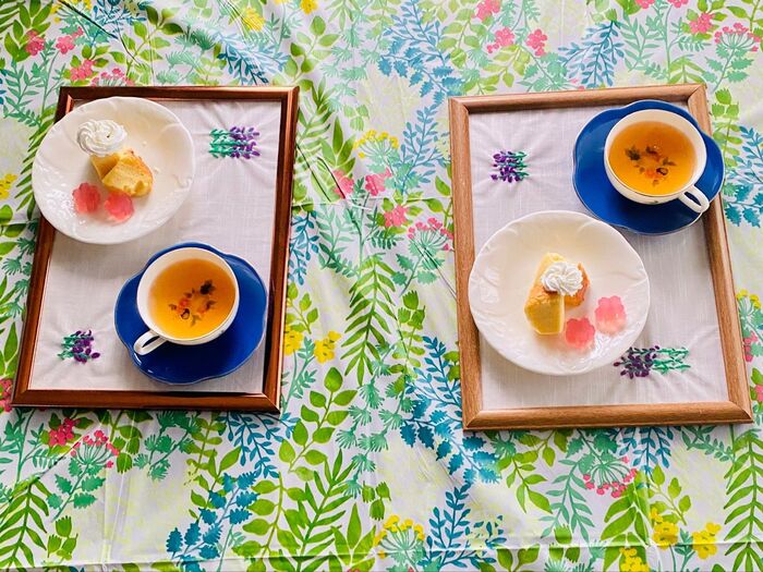 ハンドメイドのケーキや、紅茶を乗せました。