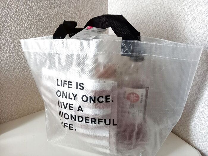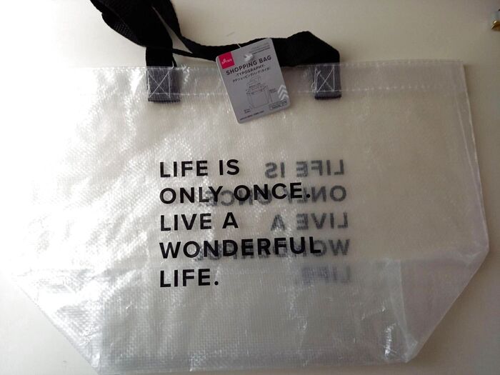 バッグには「LIFE IS ONLY ONCE .LIVE A WONDERFUL LIFE」