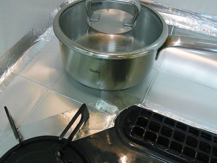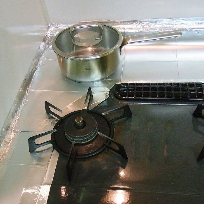 お掃除も強い力を入れなければ大丈夫!壁との境目、ガスコンロとキッチンの境目など、隙間が出来ないようにアルミテープを貼って下さいね。