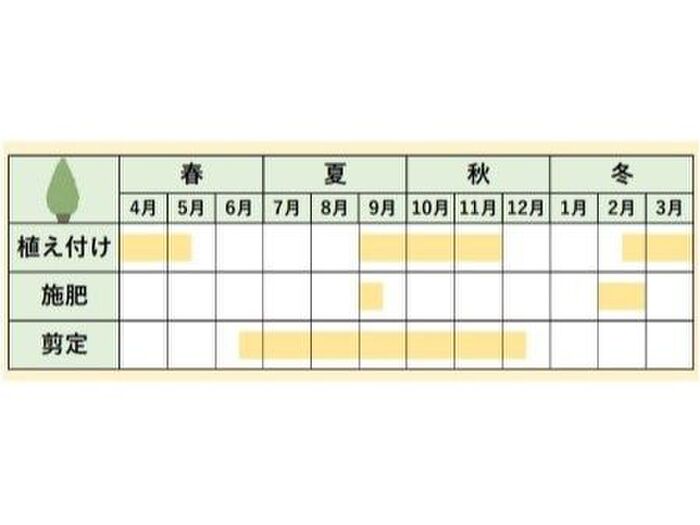 植えつけは寒暑を避けて植えつければ、特に問題はありません。日当たりを嫌う品種以外は、日当たり、水はけのよい場所を選んで植えましょう。日当たりが悪い場所では 葉色がきれいに出ないこともあるので、そういった場所では耐陰性の強い品種を植えるようにしてください。根の数も少なく、根張りが悪いイトスギ類は、風に吹きさらされるような場所では樹高を抑えて倒れないように注意しましょう。植えつけ時期は2月中旬~下旬から5月上旬、または9~11月が適期です。