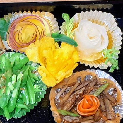 薄焼き卵の薔薇、お大根の甘酢漬けの薔薇、きんぴらのにんじんの薔薇、そしてさつまいもの薔薇!