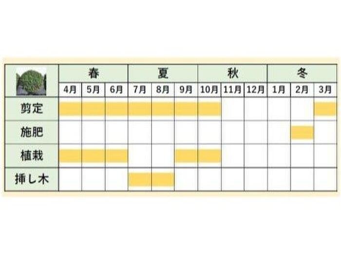 たいへん萌芽力が強いので、1~2年放任して乱れてしまった木でもつくり直しができるのが大きな特徴です。3~5年ほどすると樹形も完成するので、その後は3月から10月にかけ、年2~3回、刈り込みをしていくのが理想です。刈り込みは3~4月が適期ですが、あまり枝を伸ばさず、早め早めに新しく伸びた小枝を刈り込みばさみなどで刈るのがポイントです。また、枝に細い竹を添えたり、シュロ縄を使ったりして樹形をつくることもできます。