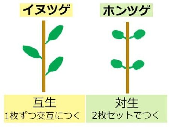 モチノキ科のイヌツゲは互生で葉の出る位置が一枚ずつずれています。やや楕円形(だえんけい)または長楕円形(ちょうだえんけい)で、 少し鋸葉(のこぎりば)があります。ツゲ科のツゲ属は「ホンツゲ」や「アサマツツゲ」と呼ばれます。イヌツゲとホンツゲはよく似ていますが、 ホンツゲの葉はイヌツゲに比べ、葉が向き合うように2枚の葉が出ている対生で丸いです。このホンツゲも花壇の縁取りや、刈込みに使われていますが、印材や櫛材にもなります。