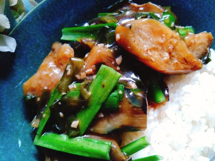 ニラを2回に分けて綺麗な緑を残すようにしました。程よいとろみでご飯とよく合う味付けにしました。