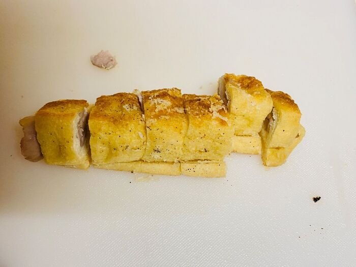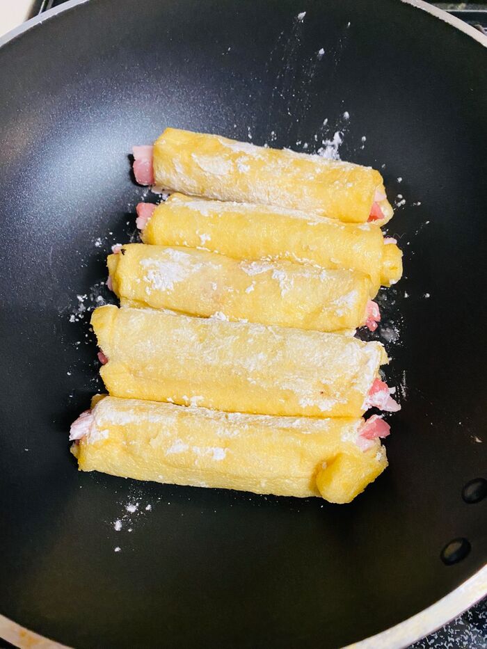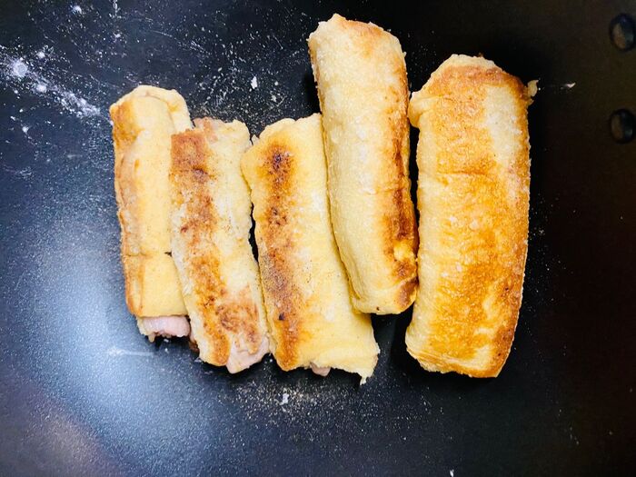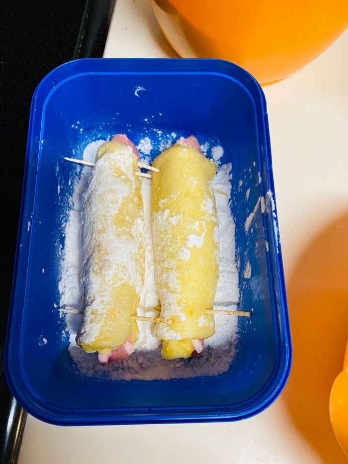 くるくる巻いて、巻き終わりを爪楊枝で刺しておきます。片栗粉をまぶします。