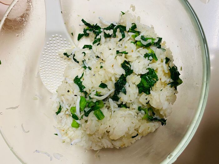 ご飯、釜揚げしらす、レンチンした菜花の葉や茎を入れ混ぜます。炒りごまをいれ混ぜます。