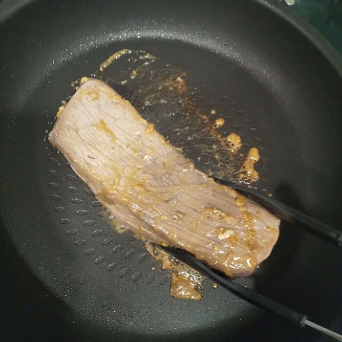 袋から肉を取り出す。タレを軽く取り除いたら、片面1分くらいずつ強火で表面を焼き付ける。