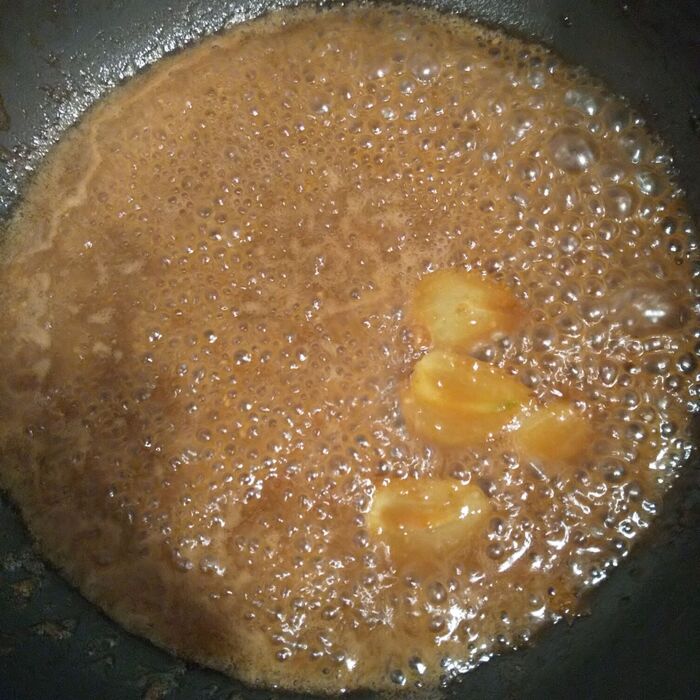 1の袋の漬けダレをフライパンに入れる。にんにくは切ってから入れる。Dを加えて弱火にかけて良く混ぜて加熱する。味が馴染んでどろっとしたら器に移す。