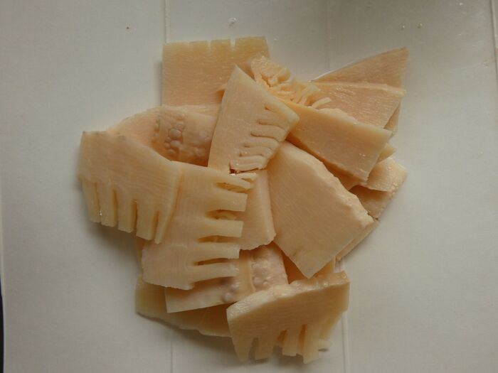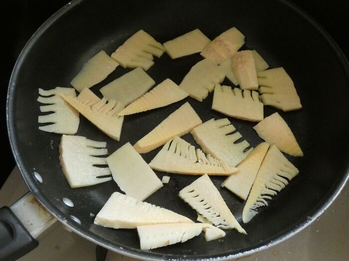 タケノコは横半分に切り、5㎜くらいの厚さに切ります。