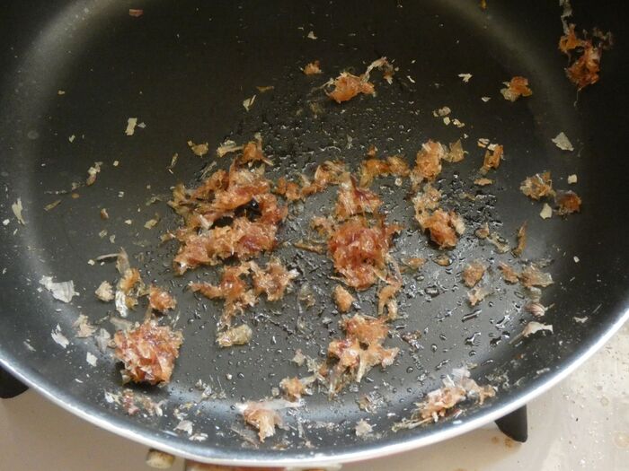フライパンに油小さじ2とかつお節を入れて炒めます。カリカリになったらしょう油を入れて混ぜ合わせ、一度取り出します。