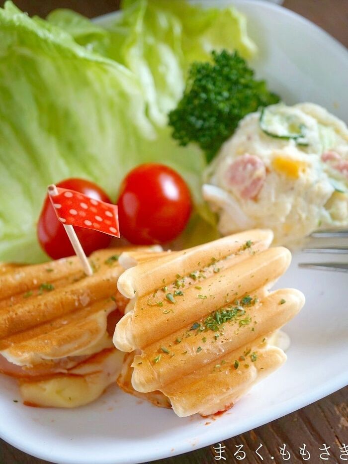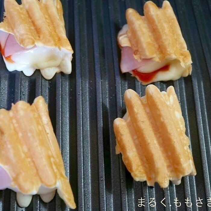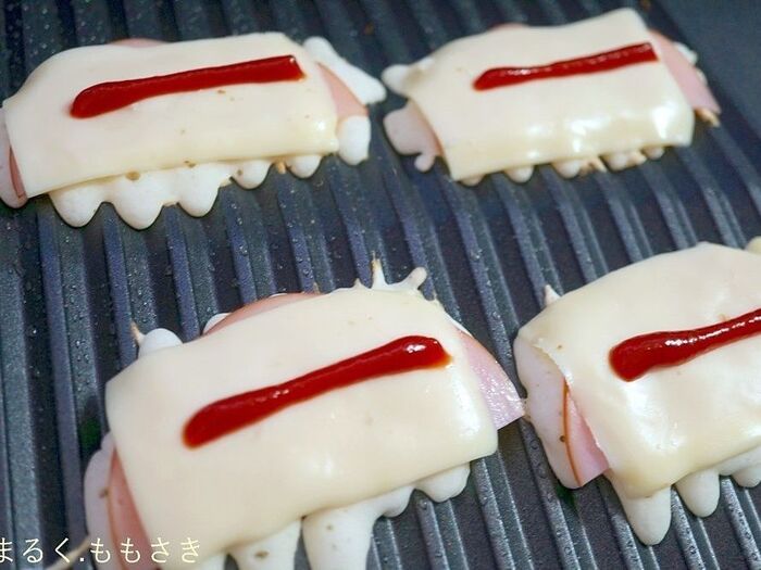 焼く前にハムとスライスタイプのチーズはそれぞれ半分に切り重ねておくと