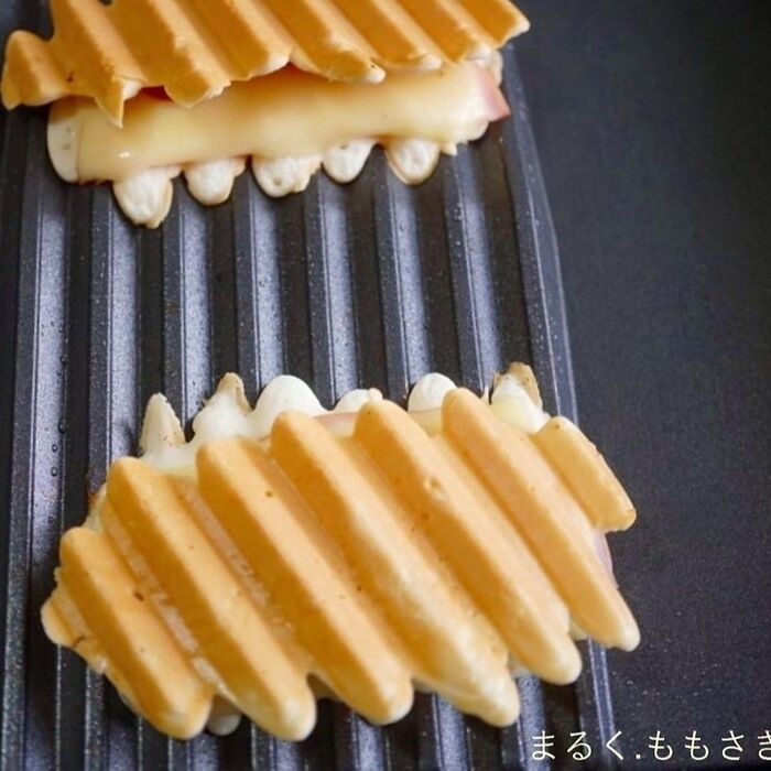 ちなみに、食パンを斜めにカットして置き、溝の型を付けて焼くと、