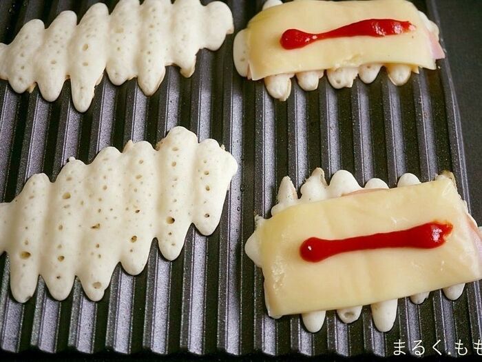 予熱したプレートに斜めに生地を置いて焼きます。