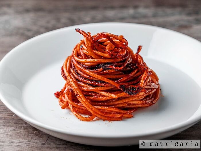 Spaghetti all'Assassinaの場合、ピューレ(パッサータ)はそのまま、ペーストはお湯で溶いて「トマトのブロード」にして使いますよ〜。