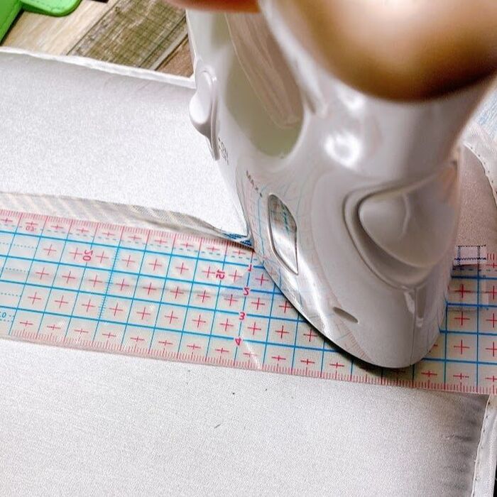 こんな風に、両端を7mm折って1.5mm幅のバイヤステープにしてください。アイロン定規が入手できない場合は、はがきに線を引いて作ることもできます。両端を折り返せればなんでもOK!