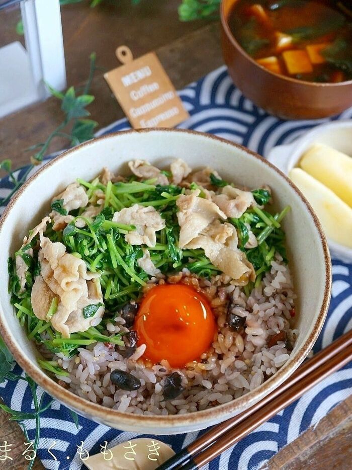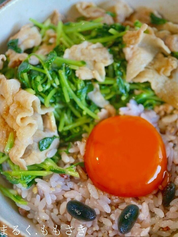 豆苗と豚肉のソテーを乗せ卵黄にんにく醤油漬けを乗せます。
