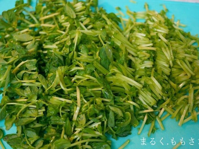 ②豆苗を茎部分は1.5cm程に切り、葉先は3cm程に切りしっかり水気を切る。