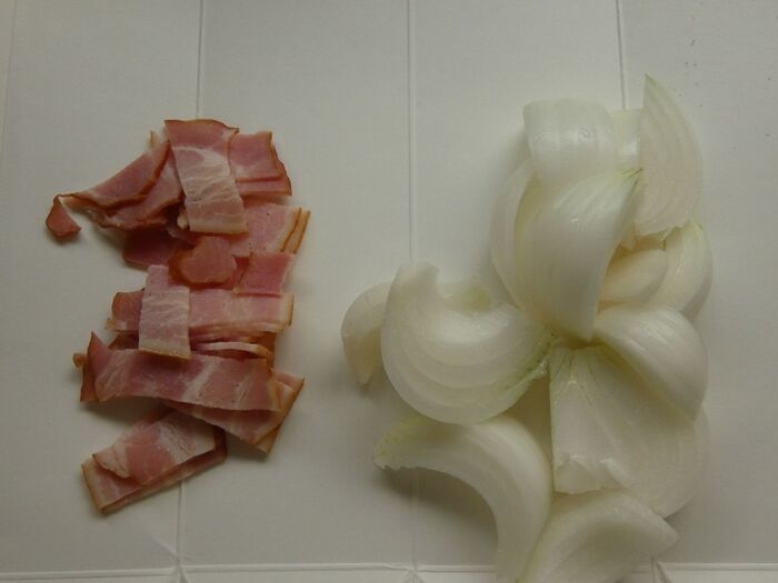 新玉葱はくし形切りにし、ベーコンは1cm幅に切ります。