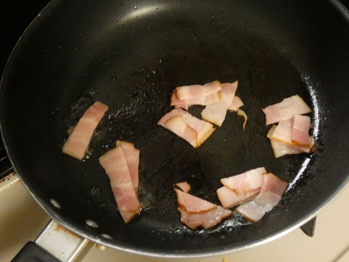 フライパンに油とガーリックチップを入れて炒め、香りがしてきたらベーコンを炒めます。
