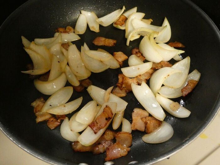 ベーコンを先に炒めて、ベーコンの脂と一緒に新玉葱を炒めるとうま味アップです。