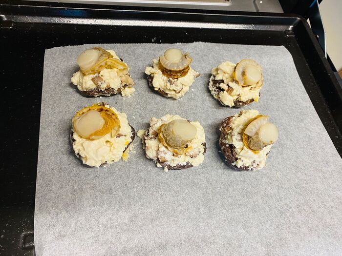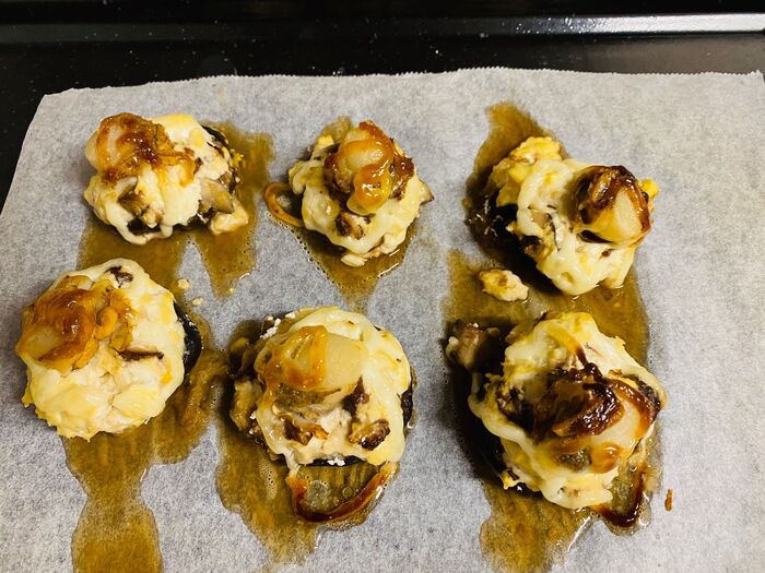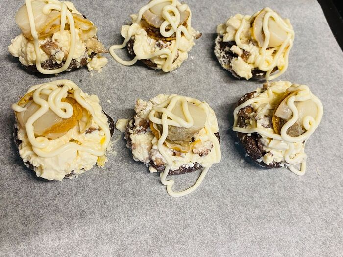 椎茸を裏がえしカップ代わりにして具材を乗せ、ほたてを乗せます。その上からマヨネーズをかけます。