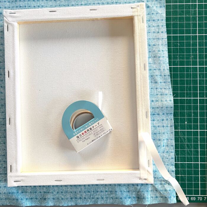 長辺を貼ったら、向かい面の長辺も両面テープを貼って、布のたるみがないように貼ります。