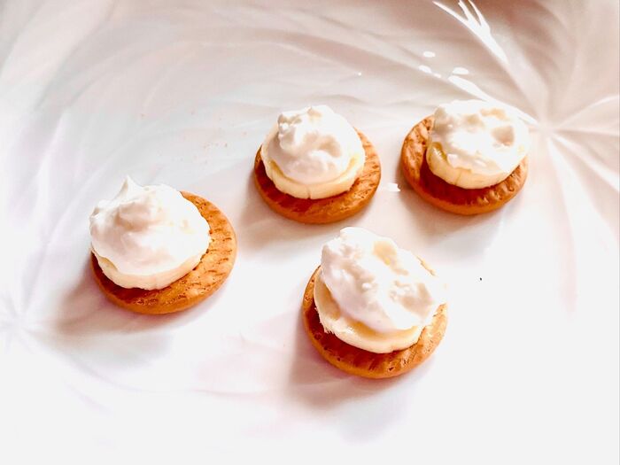 ミニサイズのビスケットに、バナナの輪切りを乗せます。オイコスをスプーンですくって乗せます。