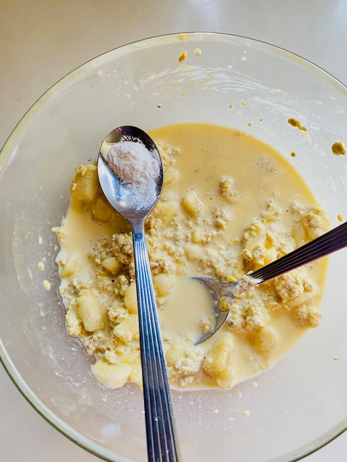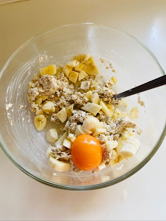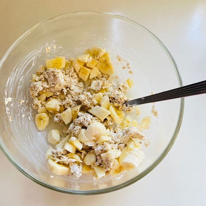細かく刻んだバナナを加えます。潰してもOKですよ。