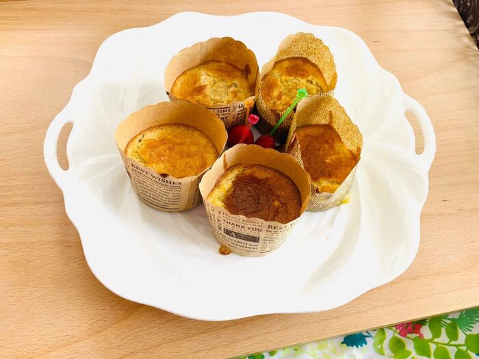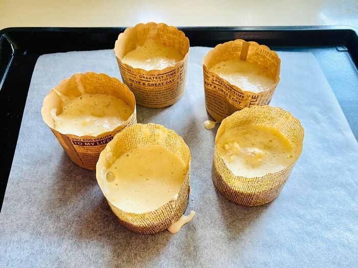 天板にマフィンカップを乗せ、生地を流し入れます。